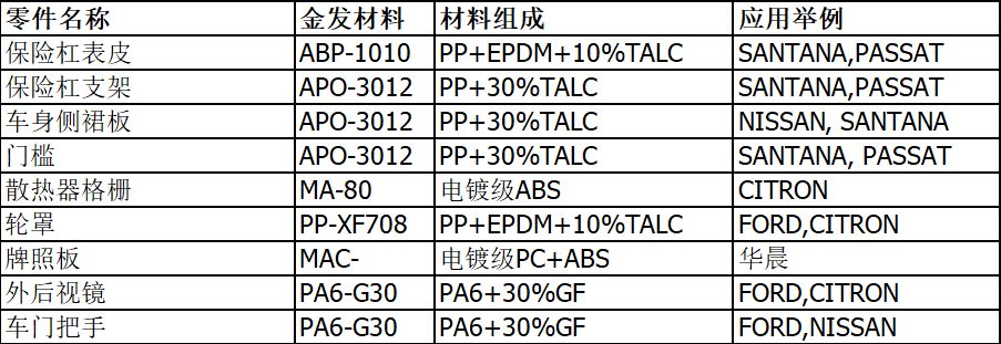 保險杠(前后,內(nèi)襯),車身側(cè)裙板,防擦條,輪罩,輪蓋裝飾件,門檻,散熱器格柵,牌照板等。