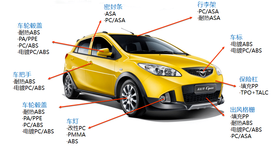 目前常用的外飾材料有 PP(聚丙烯)、ABS(丙烯腈-丁二烯-苯乙烯塑料)、ASA(苯乙烯、丙烯腈和壓克力橡膠共聚)、POM(聚甲醛)、PA(尼龍、聚酰胺)、PC(聚碳酸酯)、PE(聚乙烯)等,但具體到每一個零件所使用的材料又有所不同,以下針對具體的零部件系統(tǒng)介紹材料的選擇和應用情況。