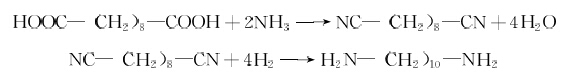 癸二胺的制法:將熔融的癸二酸與氨氣以氣液相進(jìn)行氨化脫水反應(yīng),生成癸二腈。反應(yīng)需在高溫下進(jìn)行,最高溫度為340V。癸二腈以乙醇為溶劑,雷尼鎳為催化劑,氫氧化鉀為助催化劑,在80?110°C 反應(yīng)溫度和2. 5MPa 壓力下,進(jìn)行加氫反應(yīng)而制得癸二胺。反應(yīng)式如下: